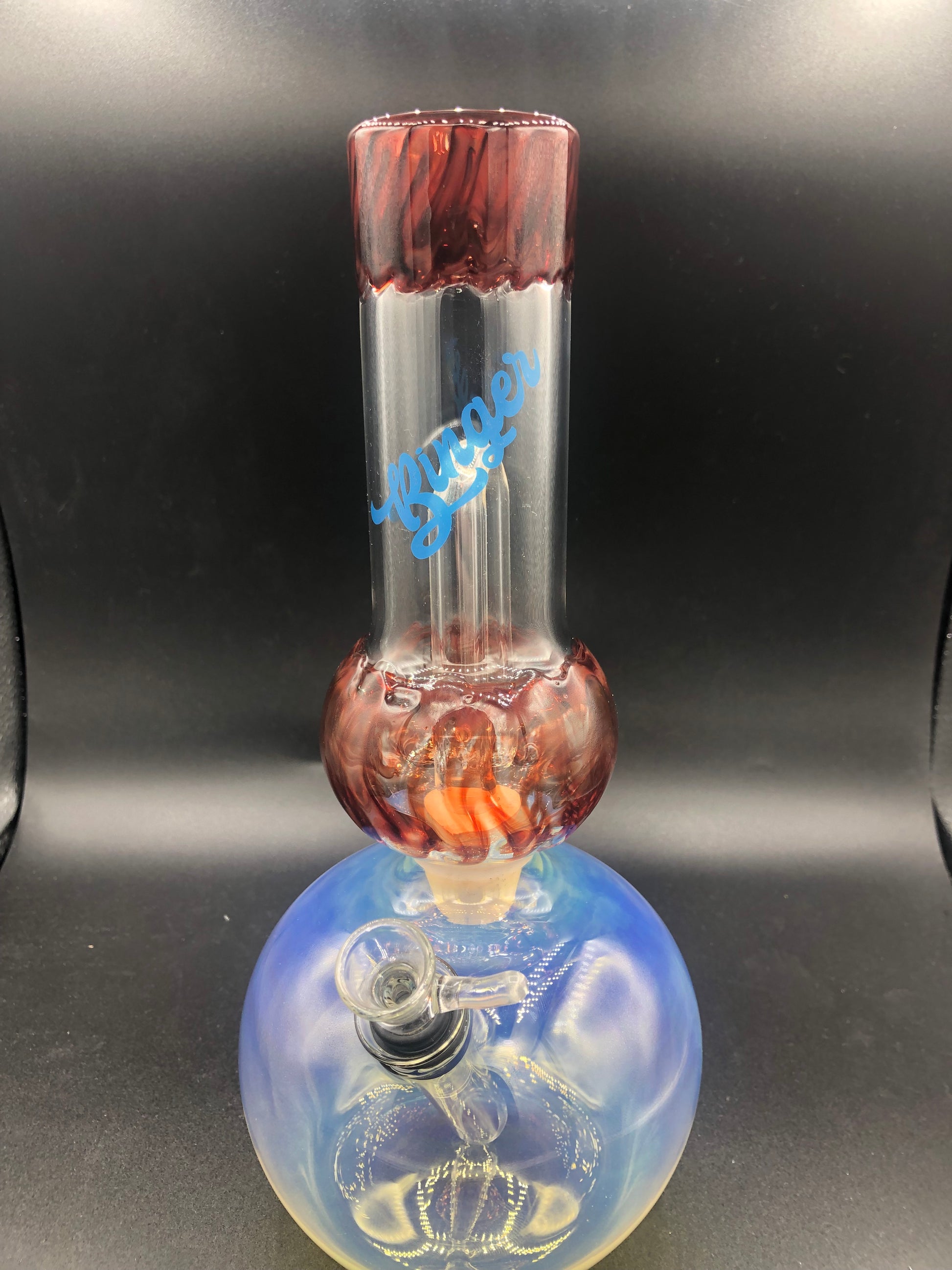 10 1/2" tall 44x4 mm tubing, grommet style 16mm down stem W/12mm O-ring style slide (old school) . Dark Ruby mouthpiece, silver fume bottom bubble, Dark Ruby 2nd bubble.