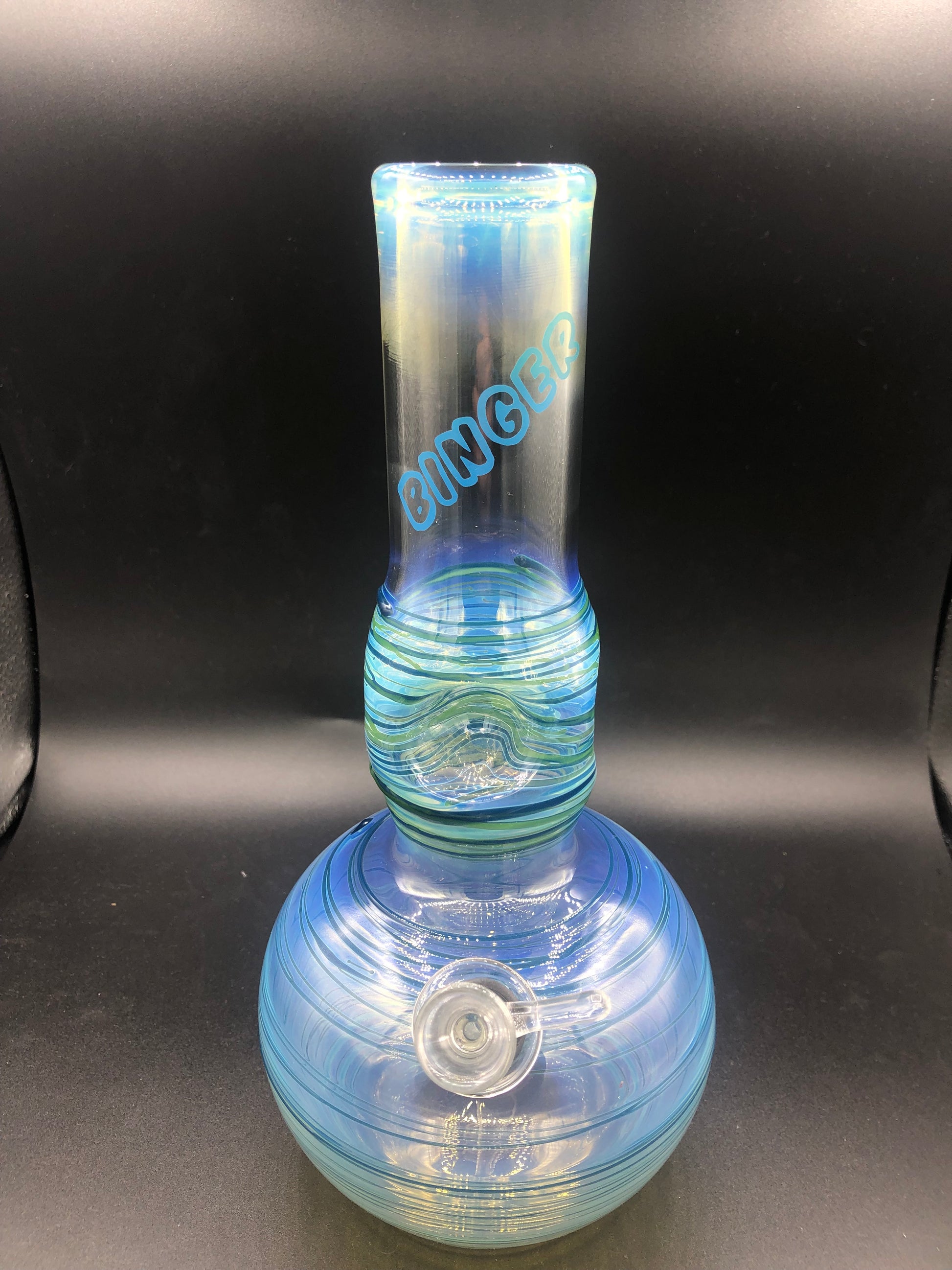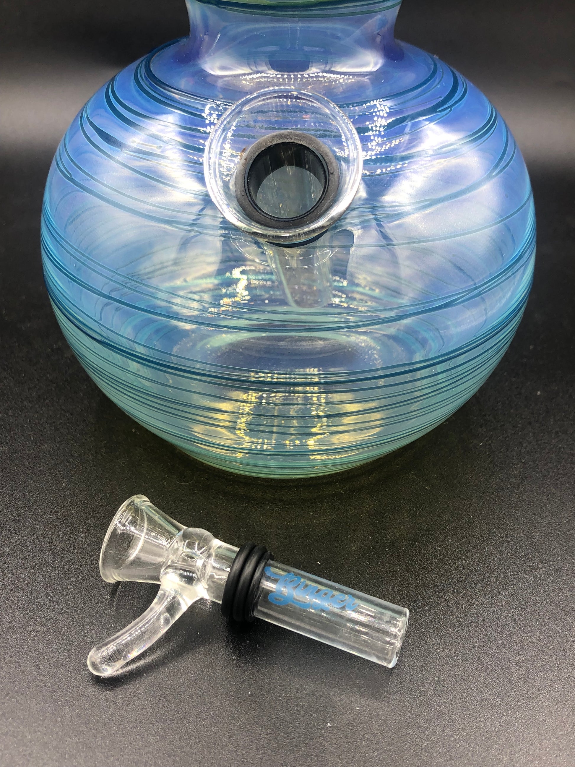 10 1/2" tall 44x4 mm tubing, grommet style 16mm down stem W/12mm O-ring style slide (old school) . Silver fume mouthpiece, blue spun on over silver fume bottom bubble, blue and green spun on over silver fume ice pinch bubble.