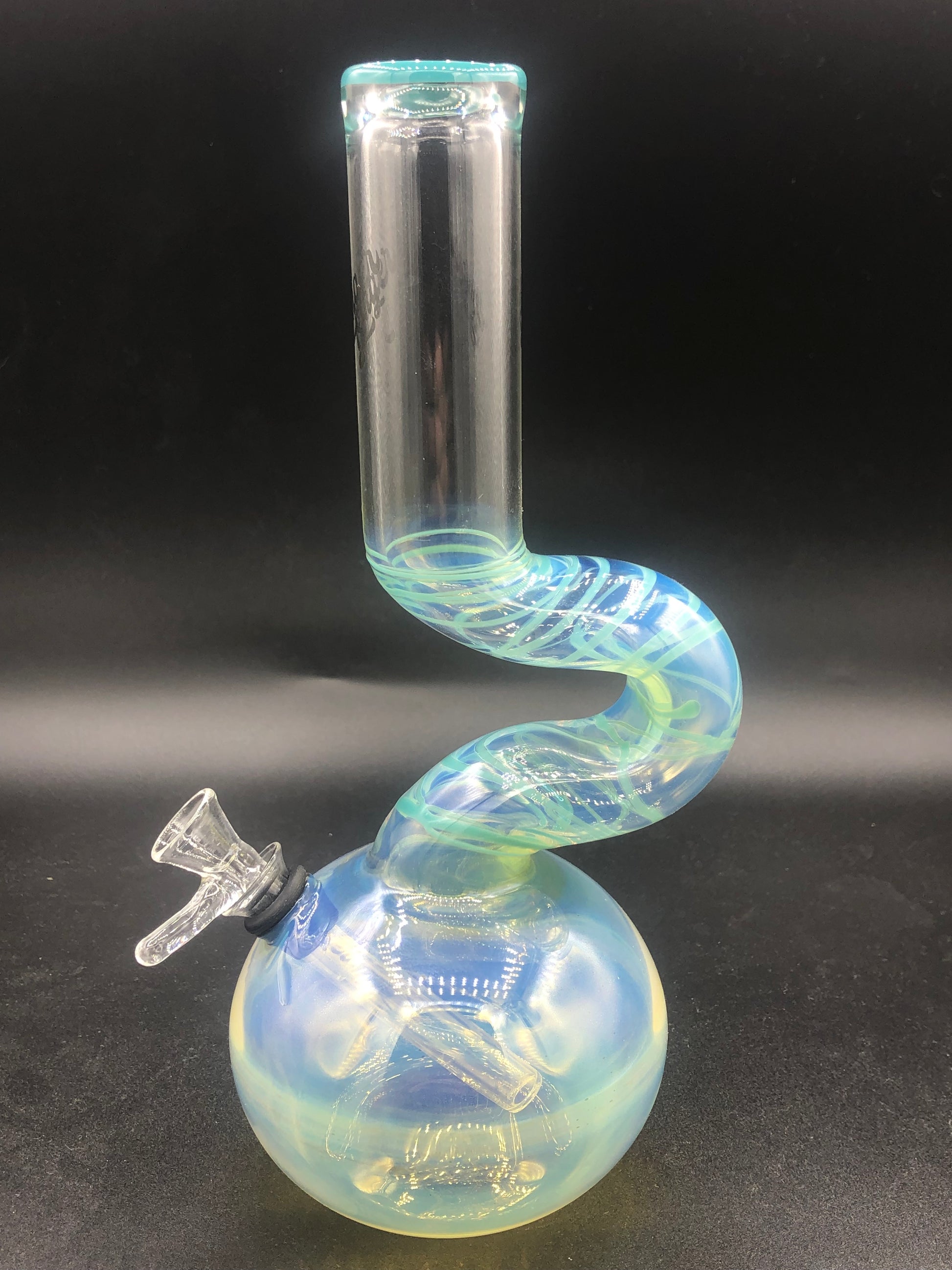 9" Tall Binger Bend 32mm tubing, grommet style 12mm down stem W/9.5mm O-ring style slide (old school) . Aqua Lip Wrap Silver Fume bottom bubble and Aqua Wrap Bend. ...